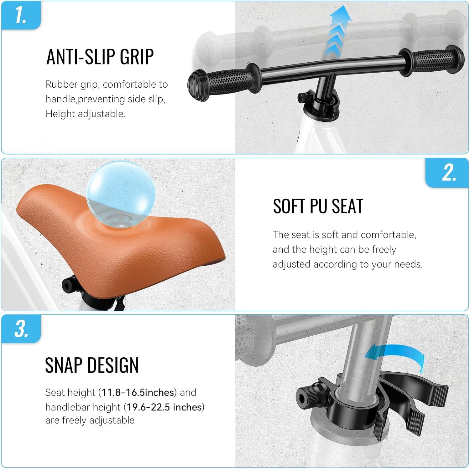 GROW WITH KIDS- Equipped with quick-release mechanism, parents can adjust the seat height(11.8-16.5inch) and handlebars height(19.6-22.5inch) without tools, easily adjust to the most suitable height for your child.