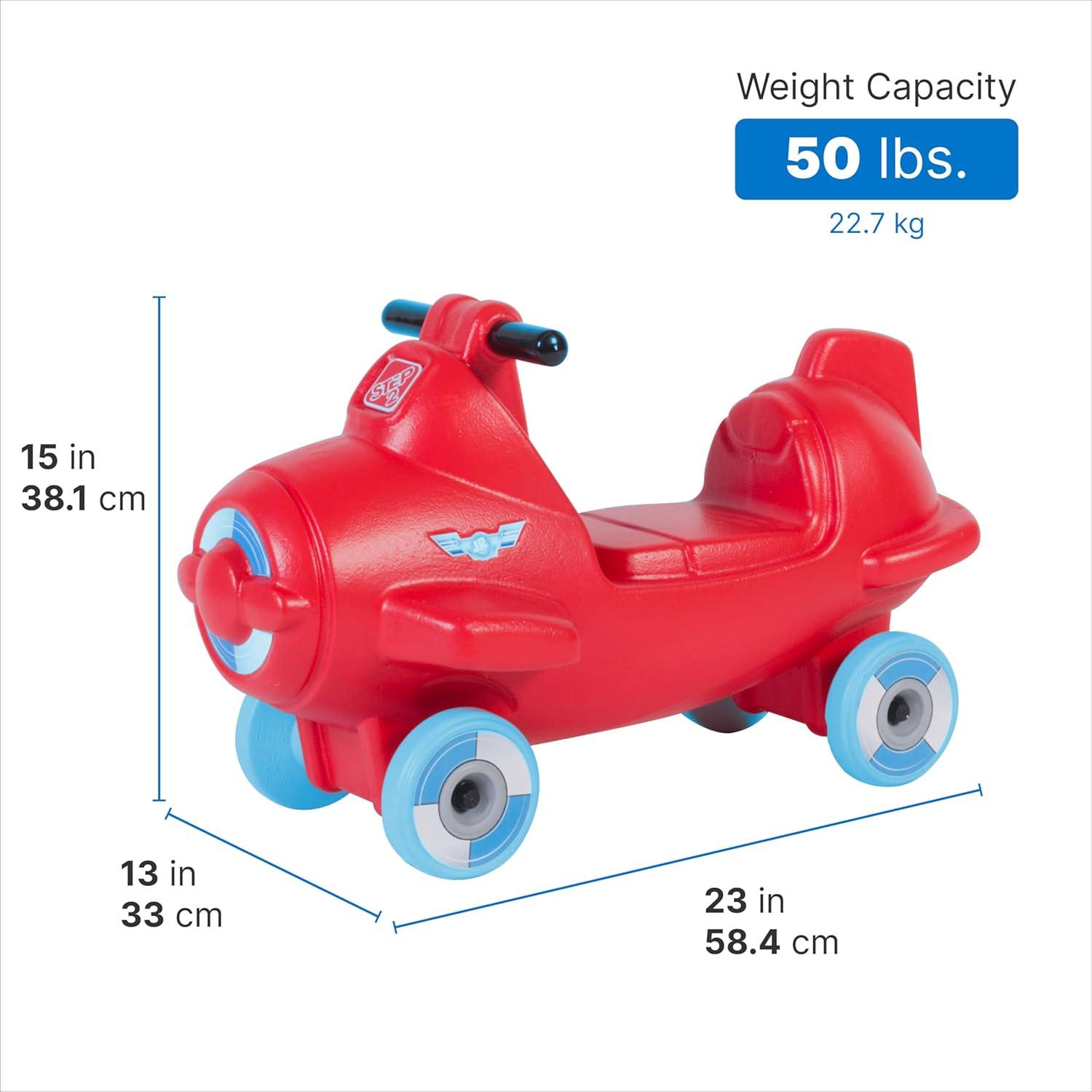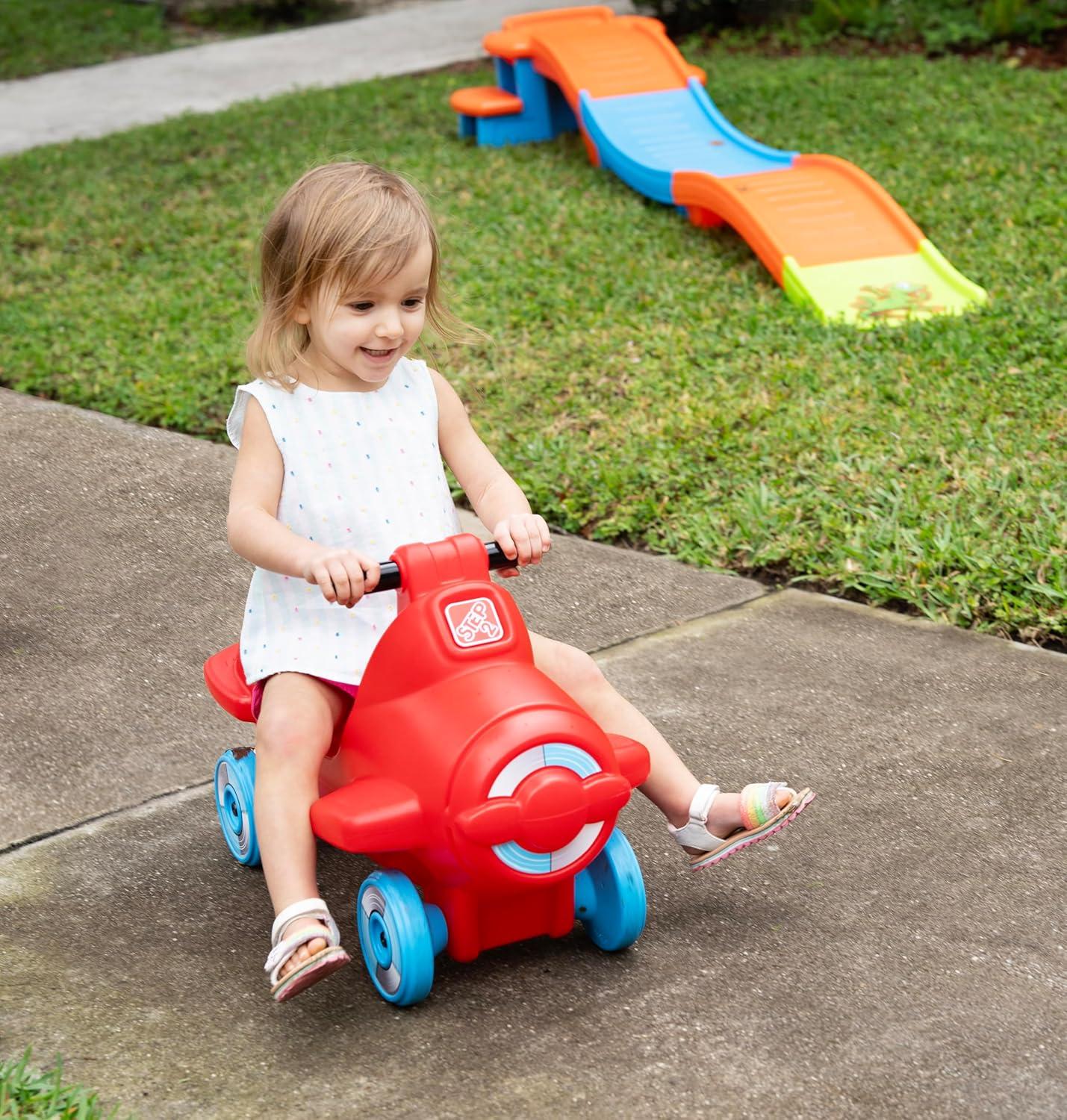 Use less words. Introducing the Step2 Foot-to-Floor Ride-On for Kids, the ultimate ride-on push car designed to ignite hours of excitement for toddlers aged 2-5 years old. This sleek ride pairs perfectly with our Up and Down Roller Coaster, offering a seamless transition from one thrilling adventure to the next, whether indoors or outdoors. With its foot-powered design, little ones can easily hop aboard and embark on thrilling journeys, fostering independence and confidence as they cruise around. Supporting up to 50 lbs, it's sturdy enough for endless playtime fun. But it's not just about fun – this ride-on promotes skill-building too. Encouraging the development of hand-eye coordination, balance, and gross motor skills, it's a fantastic addition to any child's playtime arsenal. Comfort is key, which is why our Sky Rider boasts thoughtful design elements such as footrests, a high back, and a built-in handlebar for a cozy and secure ride. Plus, it's a breeze to assemble, so the fun can start in no time. Want to take the excitement up a notch? Double the fun by adding another car to your existing roller coaster track, creating an immersive and interactive play experience that will have kids begging for more. Crafted with unparalleled durability in mind, our ride-on is constructed from double-walled plastic, ensuring it can withstand the rigors of playtime without chipping, fading, cracking, or peeling. And when it's time for cleanup, simply wipe it down for effortless maintenance. Get ready to embark on thrilling adventures with the Step2 Sky Rider Foot-to-Floor Ride-On – where fun knows no bounds, and imaginations run wild.